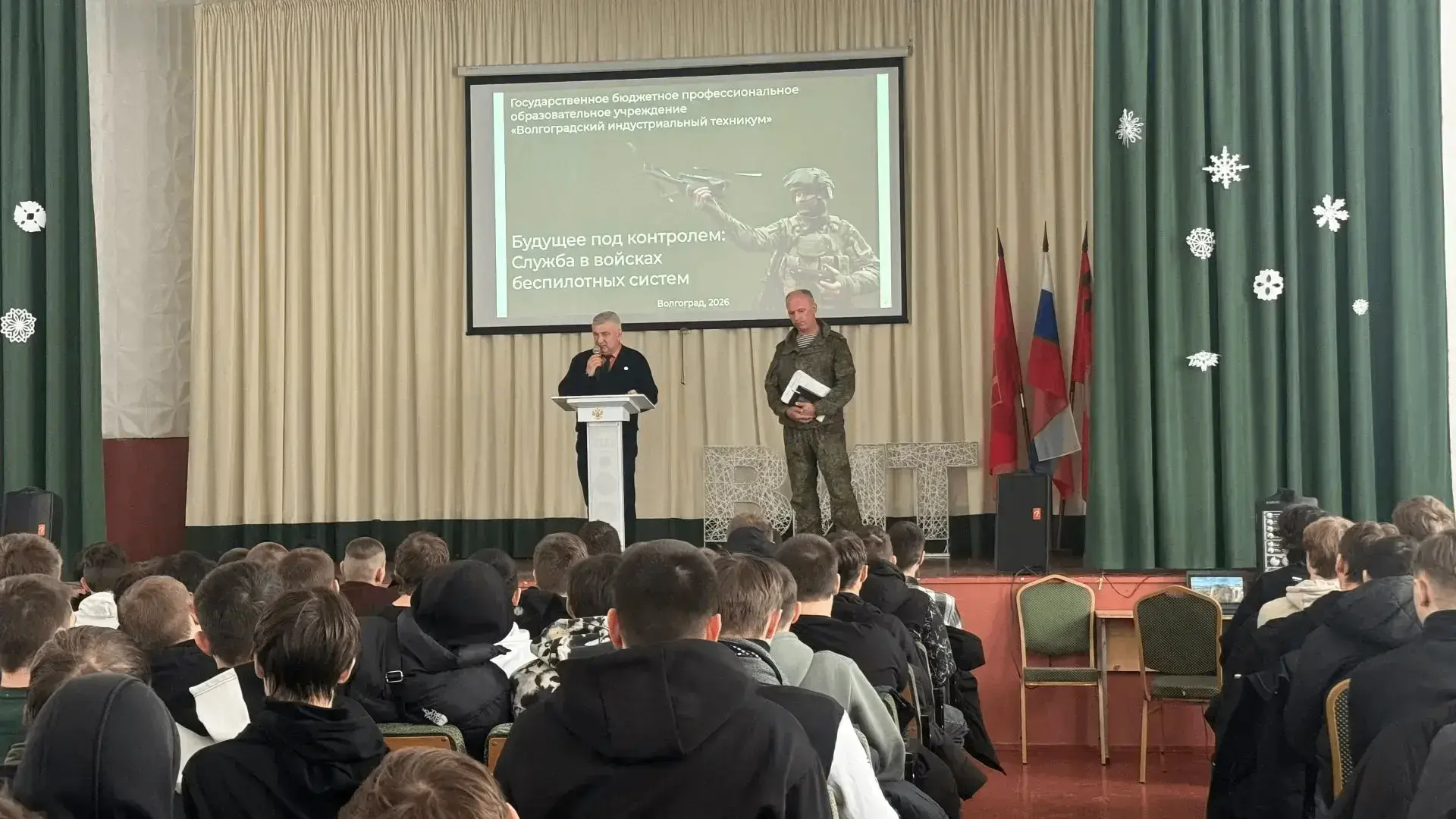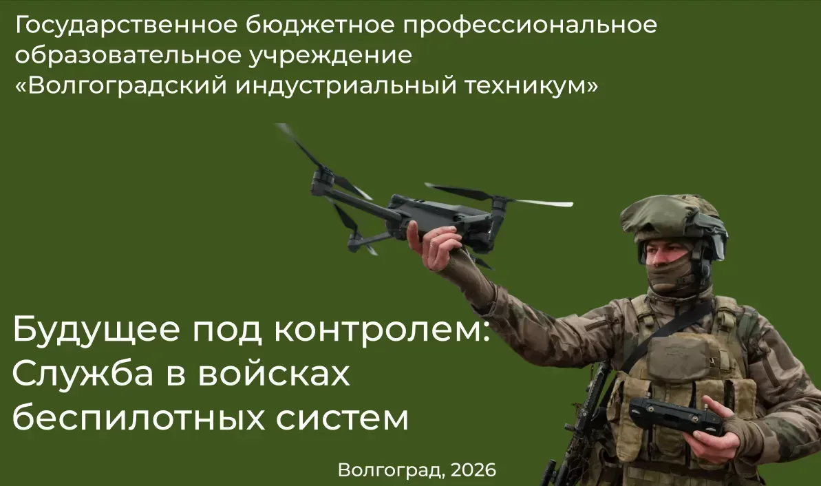 Престижная служба в войсках беспилотных систем   21 января 2026 года в ГБПОУ «Волгоградский индустриальный техникум» состоялось информационное мероприятие – «Будущее под контролем: служба в войсках беспилотных систем». Его участниками стали юноши 1-4 курсов ГБПОУ ВИТ всех специальностей и профессий.