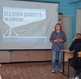 В рамках Дня единых действий преподавателем Бородкиной С.А. был проведен урок «Без срока давности». Преподаватель обсудила с ребятами понятие «геноцид», рассказала им о событиях времен Великой Отечественной Войны, об ужасах геноцида советского народа нацистами, также ребята ознакомились с документальными материалами, подготовленными в рамках проекта «Без срока давности», разоблачающими человеконенавистническую сущность нацистов.