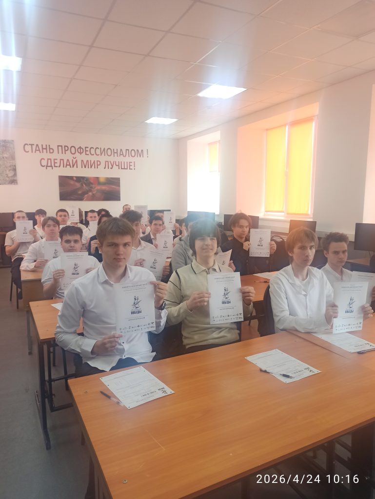 24 апреля 2026 года на базе ГБПОУ «Волгоградский индустриальный техникум» главного и третьего корпусов была организована площадка для проведения международного исторического просветительского мероприятия «Диктант Победы». Активное участие в нём приняли обучающиеся групп МТН-125, МТН-115, СЭЗиС- 115 (ответственные преподаватели и методисты: Фимина А.А., Кутыга Г.А., Синельников С.П., Коптева Е.Н., Гринько Д.С., Бакулина О.В.).