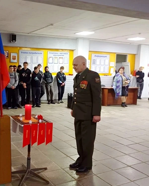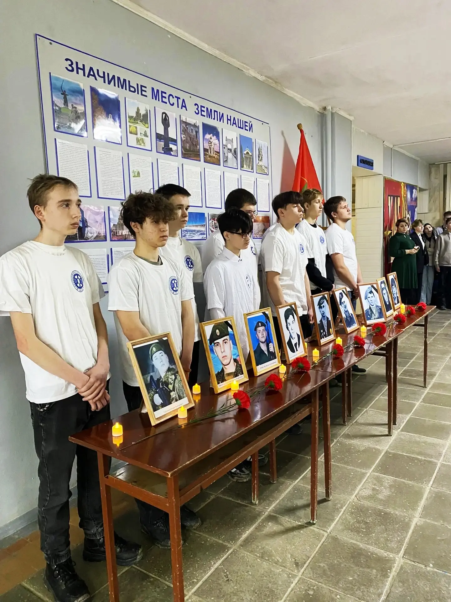 На мероприятии присутствовал почётный гость — ветеран двух Чеченских войн, старший прапорщик в отставке Безруков Владимир Иванович. Ему было предоставлено право зажечь Свечу Памяти. К портретам героев- наших выпускников – были возложены красные гвоздики. Студенты почтили память героев, отдавших жизнь в Афганистане, Чечне и ходе специальной военной операции, минутой молчания. Память о каждом из них навсегда сохранится в наших сердцах.
