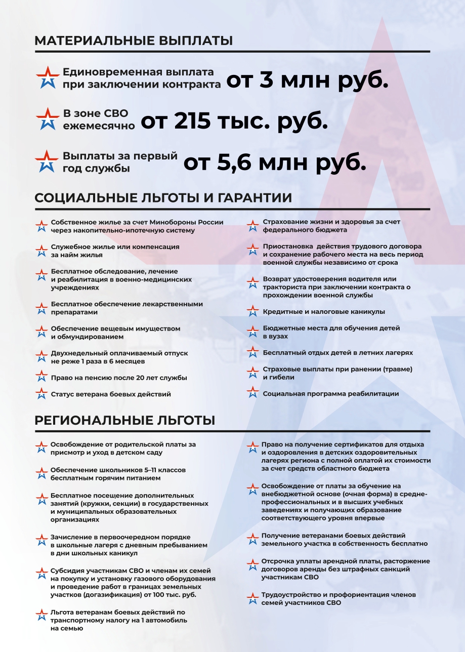 – Денежное довольствие в зоне СВО от 215.000 рублей на удалении от линии боевого соприкосновения!