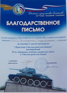 30.01.2024г на базе МОУ СШ 75 прошла квест-викторина “Дорогами Сталинградской битвы”, в которой приняли участие студенты ГБПОУ ВИТ. Организаторами мероприятия являются Серебряные волонтеры Совета ветеранов Красноармейского района г. Волгограда. Викторина посвящена 81-й годовщине победы советских войск в Сталинградской битве.